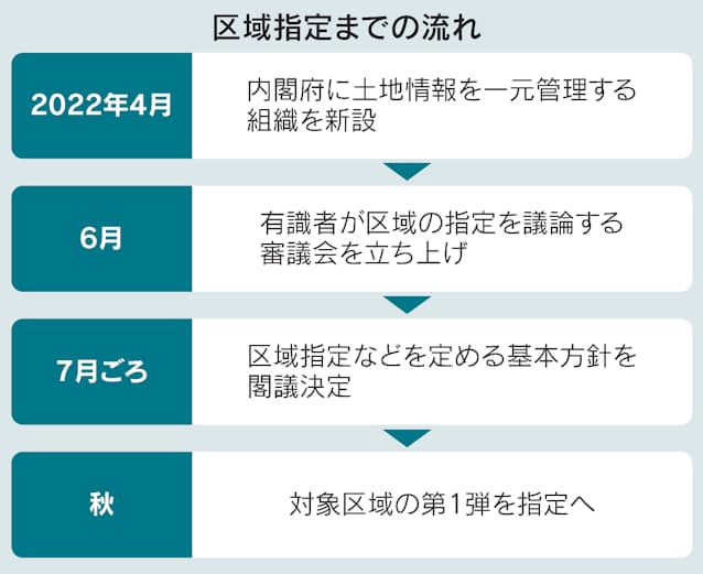 今年6月に通常国会で成立した。中止勧告や命令に従わない場合は懲役2年以下か罰金200万円以下を科す。司令部といった機密情報が集まる拠点の周辺などは「特別注視区域」とみなし、土地売買に事前の届け出を義務付ける。外国資本が不適切な目的で日本の土地を取得し、利用するリスクを減らす狙いがある。