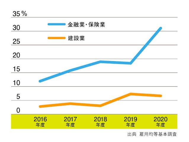 女性管理職の割合は、2019年度:18.5% 2020年度:19.8% 2021年度:22.2%と上昇しているが以前2割台