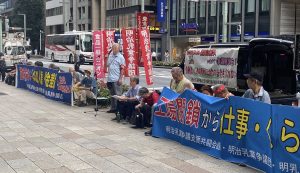 京橋エドグラン、明乳争議座込みを約30名で。市川提訴団のたけださん、戸田町工場のやぐちさん(病床からの手紙代