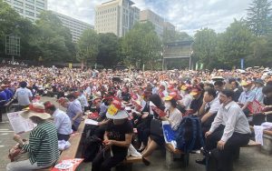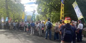 医労連などの「いのちをまもる」総行動。医労連委員長の開会挨拶、野音集会は会場2200人、オンライン200人以上参加。 久久しぶりに満員の日比谷野外音楽堂。改修工事のため9月いっぱいで休止。最後の機会か、壇上で記念撮影する組合多数。 途中、古川橋病院岩淵さん解雇雇止め争議東京地裁法廷傍聴へ。その後野音に戻ったが2200人となると出発待ち30分。東京隊列は最後。医労連全国から集まり、東京 は2割ぐらいか。八重洲まで歩き、そのまま京橋エドグラン、明乳争議座込みに参加しました。![]()