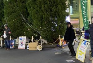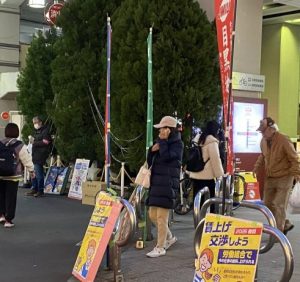 2026年2月26日 目黒労協春闘宣伝。学芸大学駅で7人で約40分間。春闘で賃上げを!、賃上げ要求しよう、最低賃金引き上げを!と、用意したティッシュいりチラシ200組まききりました。残は7組。