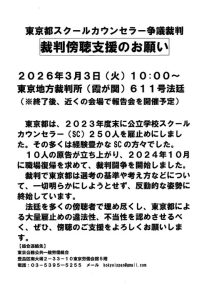 2026年3月3日東京都スクールカウンセラー争議、東京地裁6階から弁護士会館5階へ。20人ほどが傍聴席満員ではいれず、弁護士会館5階会議室も約60名で、こちらも一杯。面接評定表、緊密評定、合格基準など、4点の文書提出要求。都教委側は、1年ごとの採用で、採用期待権はそもそも存在しないと、提出を拒んでいる。常勤的非常勤という矛盾した状態が繰り返されている。