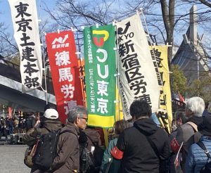 目黒からも、東京土建目黒支部の旗。東京では、東京地評、自治労連、東京土建本部、都教組などなど。東京清掃や東交、都高教、東京教組、CU東京。国労、JR総連なども含め、市民団体と労働組合、政党の旗が並びました。