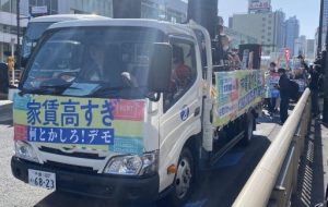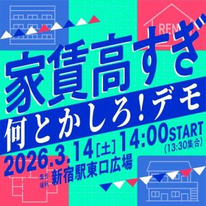 2026年3月14日午後 新宿、住まいの貧困ネットワーク+首都圏青年ユニオン「家賃高すぎ 何とかしろ!」デモ。新宿駅東口旧アルタ前から西、南と回り、旧都電専用軌道後まで。200人ぐらいか。労組の旗は、東京地評、新宿一般、新宿区労連、都職労住宅局支部など。他は多数のプラカード。シュプレヒコールも含め、「家賃高すぎ」に集中。シングルイッシュのデモでした。